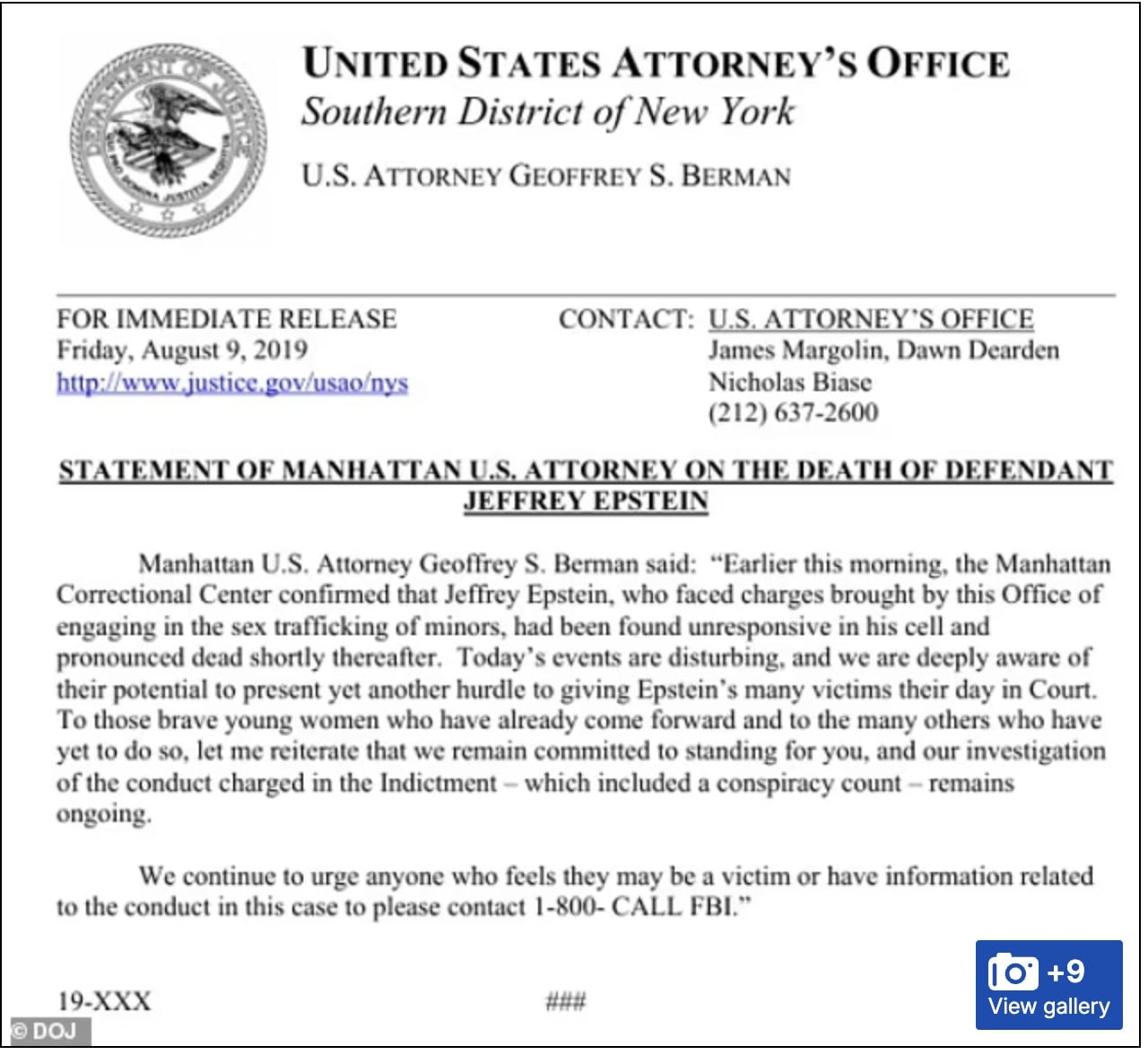 Το έγγραφο φέρει την υπογραφή του Γραφείου του Εισαγγελέα των Ηνωμένων Πολιτειών για τη Νότια Περιφέρεια της Νέας Υόρκης και ημερομηνία Παρασκευή 9 Αυγούστου 2019. Σε αυτό αναφέρεται ότι ο Epstein είχε «βρεθεί αναίσθητος στο κελί του και διαπιστώθηκε ο θάνατός του λίγο αργότερα».