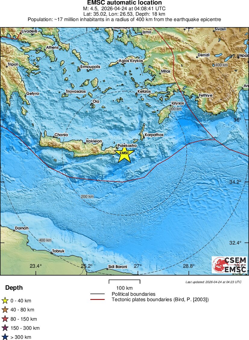 - Το επίκεντρο εντοπίζεται 32 χιλιόμετρα ανατολικά νοτιοανατολικά του Παλαικάστρου Σητείας.