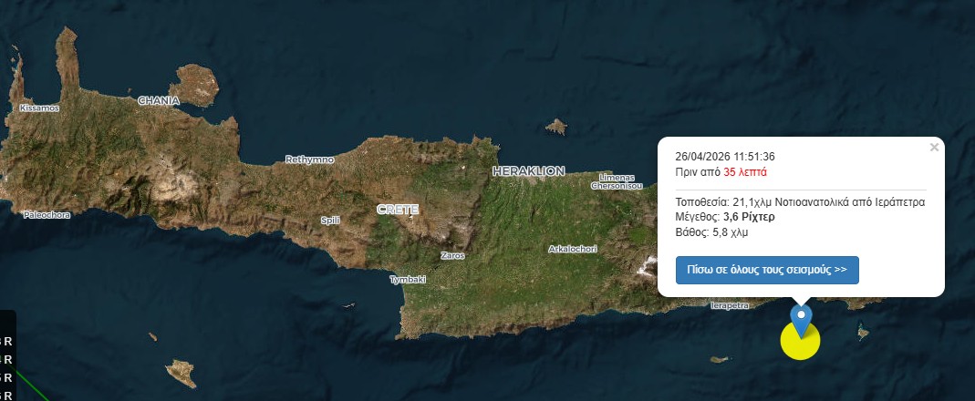 Σεισμική δόνηση μεγέθους 3,6 βαθμών της κλίμακας Ρίχτερ σημειώθηκε το πρωί της 26ης Απριλίου 2026, στις 11:51, στην ευρύτερη περιοχή της Ιεράπετρας.