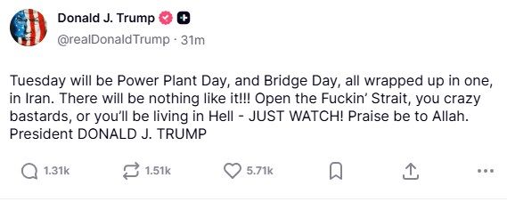 «Την Τρίτη θα είναι η Ημέρα του Σταθμού Παραγωγής Ηλεκτρικής Ενέργειας και η Ημέρα της Γέφυρας, όλα μαζί, στο Ιράν. Δεν θα υπάρξει τίποτα παρόμοιο!!! Ανοίξτε τα Γ@@@@@@@ Στενλα, τρελοί μπάσταρδοι, αλλιώς θα ζείτε στην Κόλαση – ΠΕΡΙΜΕΝΕΤΕ ΝΑ ΔΕΙΤΕ! Δόξα τω Αλλάχ. Πρόεδρος ΝΤΟΝΑΛΝΤ ΤΖ. ΤΡΑΜΠ»