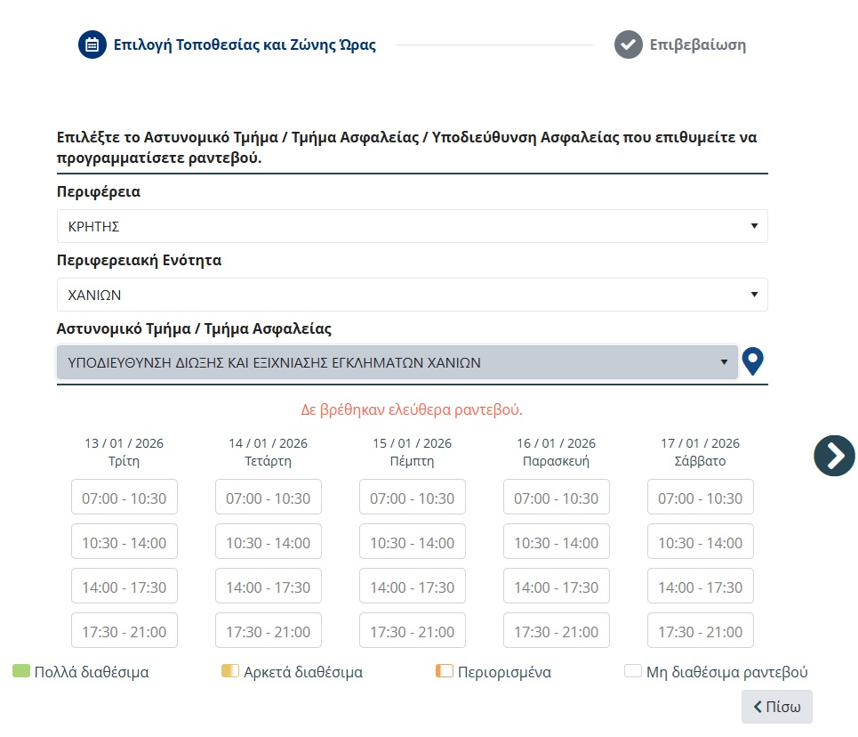 Μια κάπως καλύτερη εικόνα παρουσιάζουν τα Αστυνομικά Τμήματα σε Ρέθυμνο και Λασίθι, όπου υπάρχουν ακόμη ελεύθερες ημερομηνίες για όσους κινηθούν άμεσα.