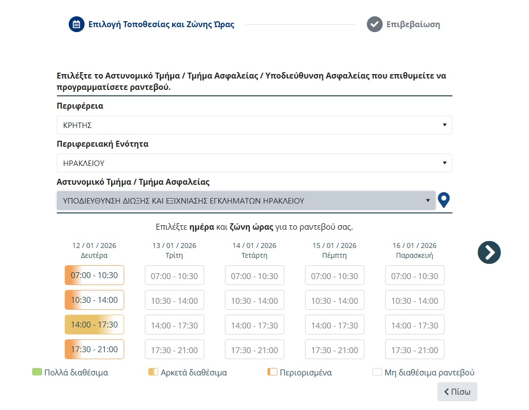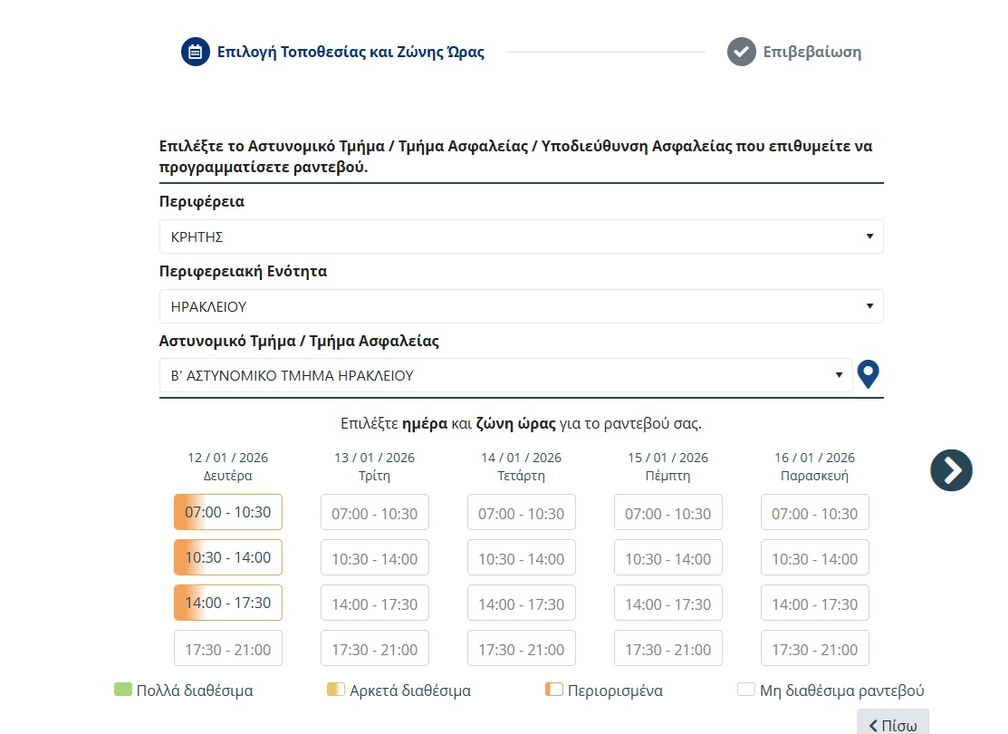 - Υπάρχουν λίγα διαθέσιμα ραντεβού σε μικρότερες περιοχές της Κρήτης, όπως τα Α.Τ. Βιάννου και Μαλεβιζίου.