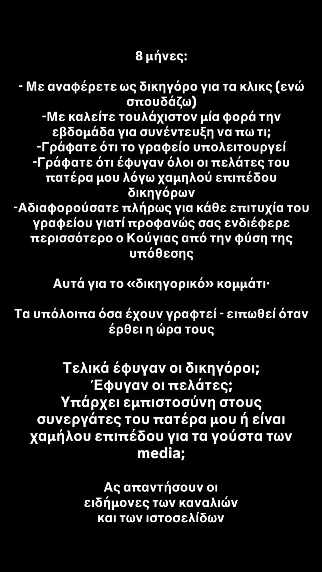 Τελικά έφυγαν οι δικηγόροι; Έφυγαν οι πελάτες; Υπάρχει εμπιστοσύνη στους συνεργάτες του πατέρα μου ή είναι χαμηλού επιπέδου για τα γούστα των media; Ας απαντήσουν οι ειδήμονες των καναλιών και των ιστοσελίδων», έγραψε ο Χρίστος Κούγιας.