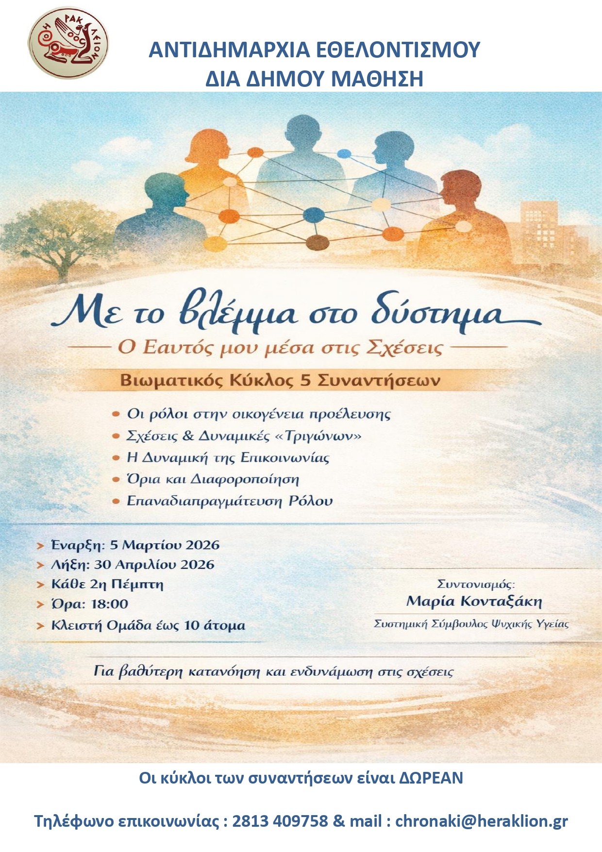 Ο Δήμος Ηρακλείου μέσω της Αντιδημαρχίας Εθελοντισμού διοργανώνει ένα νέο κύκλο βιωματικών συναντήσεων με ελεύθερη συμμετοχή, από 5 Μαρτίου έως τις 30 Απριλίου 2026, με τίτλο «Με το βλέμμα στο σύστημα – Ο Εαυτός μου μέσα στις Σχέσεις».