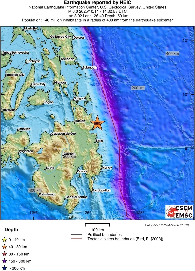 Ο σεισμός σημειώθηκε σε βάθος 59 χιλιομέτρων και σε απόσταση 10 χλμ. από την πόλη Καγκουάιτ, στην επαρχία Σουριγκάο ντελ Σουρ, σύμφωνα με το USGS.