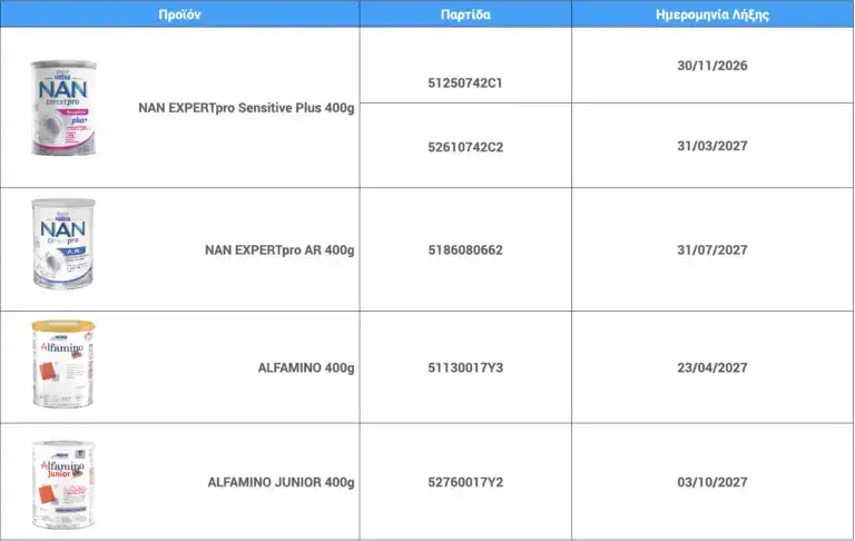 - Διαθέσιμη είναι η λίστα των προϊόντων στο site της Nestle και η γραμμή εξυπηρέτησης για καταναλωτές.
