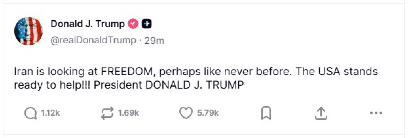 Η ανάρτηση του Αμερικανού προέδρου στο μέσο κοινωνικής δικτύωσης Truth Social, ότι το Ιράν «κοιτάζει προς την ελευθερία, ίσως όπως ποτέ άλλοτε» και ότι οι Ηνωμένες Πολιτείες είναι έτοιμες να βοηθήσουν θεωρήθηκε προαναγγελία αμερικανικής επίθεσης στο Ιράν με τον Αμερικανό δισεκατομμυριούχο Μπιλ Άκμαν να σχολιάζει στα μέσα κοινωνικής δικτύωσης: «Ξεκινάμε»…