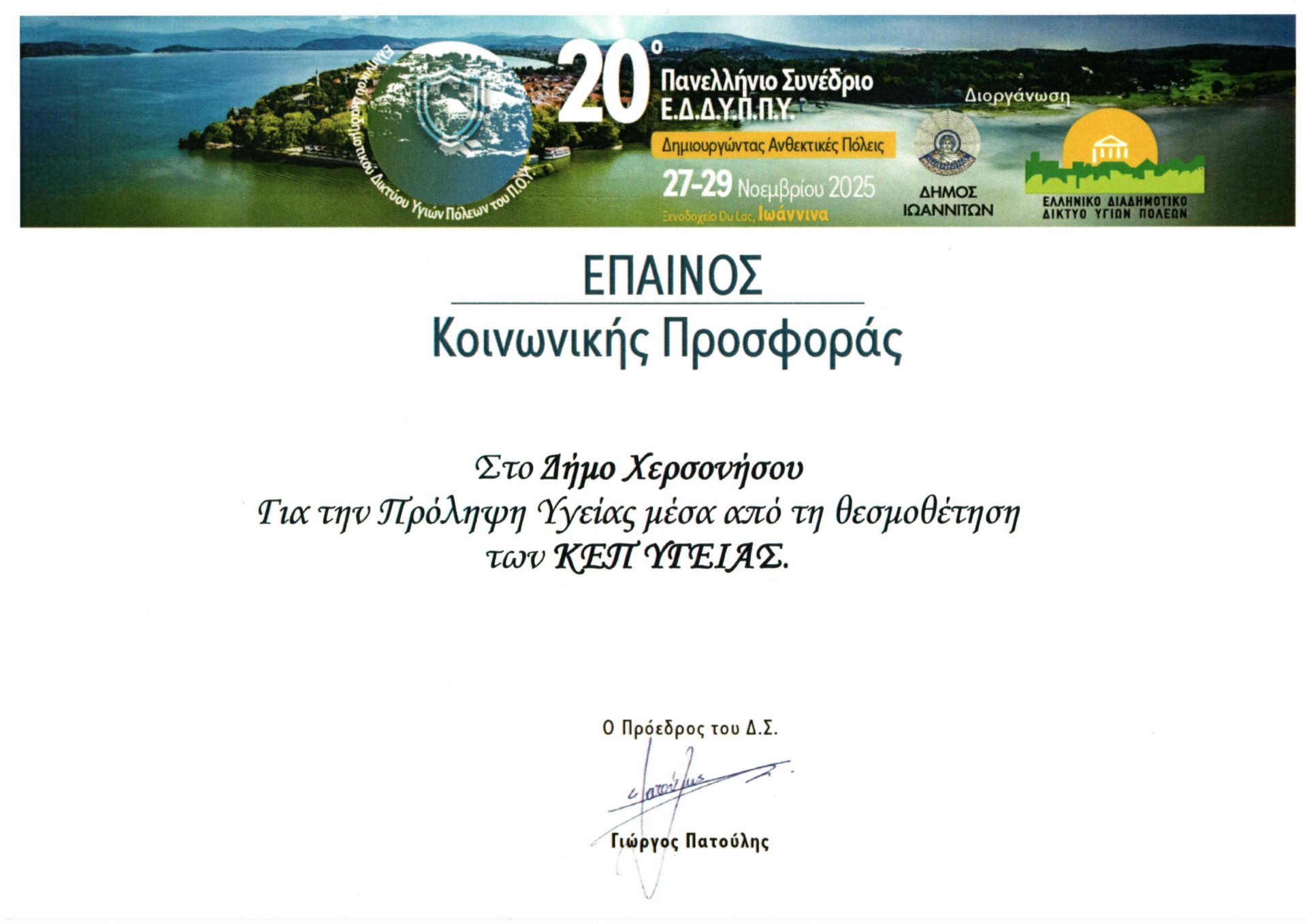 Το συνέδριο πραγματοποιήθηκε στα Ιωάννινα, ενώ τον Έπαινο έλαβε από τον πρόεδρο του ΕΔΔΥΠΠΥ & ΙΣΑ κ. Γιώργο Πατούλη, ο Αντιδήμαρχος Δημόσιας Υγείας, Κοινωνικής Πολιτικής και Αλληλεγγύης κ. Γιώργος Μαστοράκης. Κατά τον σύντομο χαιρετισμό του ο Αντιδήμαρχος, ο οποίος είχε αναλάβει την πρωτοβουλία που έγινε πράξη για τη δημιουργία του ΚΕΠ Υγείας, ευχαρίστησε το Εθνικό Διαδημοτικό Δίκτυο Υιών Πόλεων και τόνισε τη σημασία της συνεχούς συνεργασίας και της ενίσχυσης δομών που στηρίζουν τον δημότη.