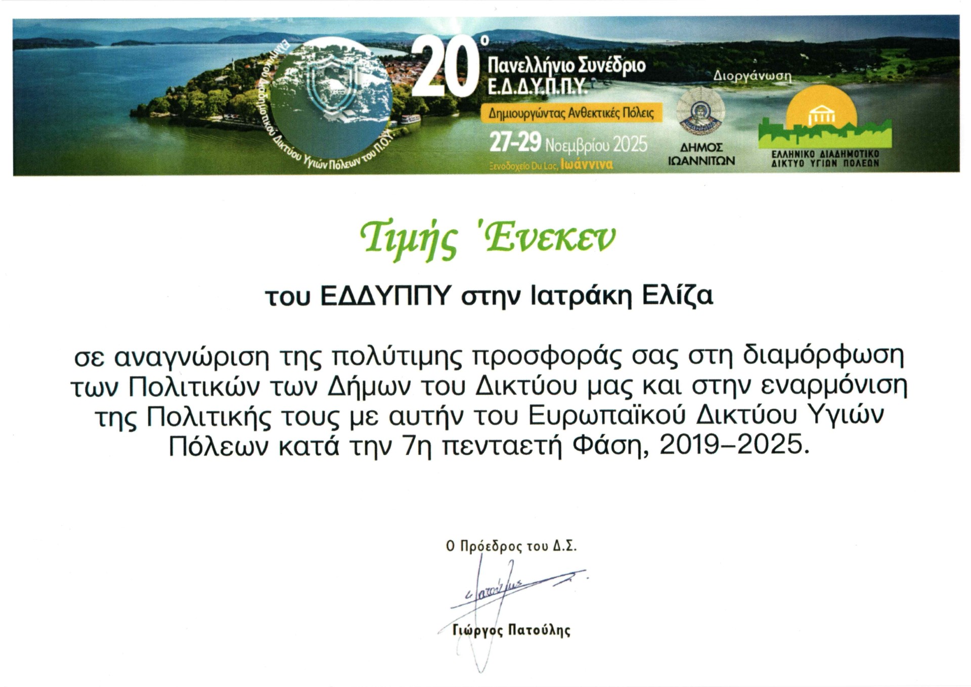 Στο 20ο Πανελλήνιο Συνέδριο του Ελληνικού Διαδημοτικού Δικτύου Υγιών Πόλεων και Προαγωγής Υγείας του Π.Ο.Υ.