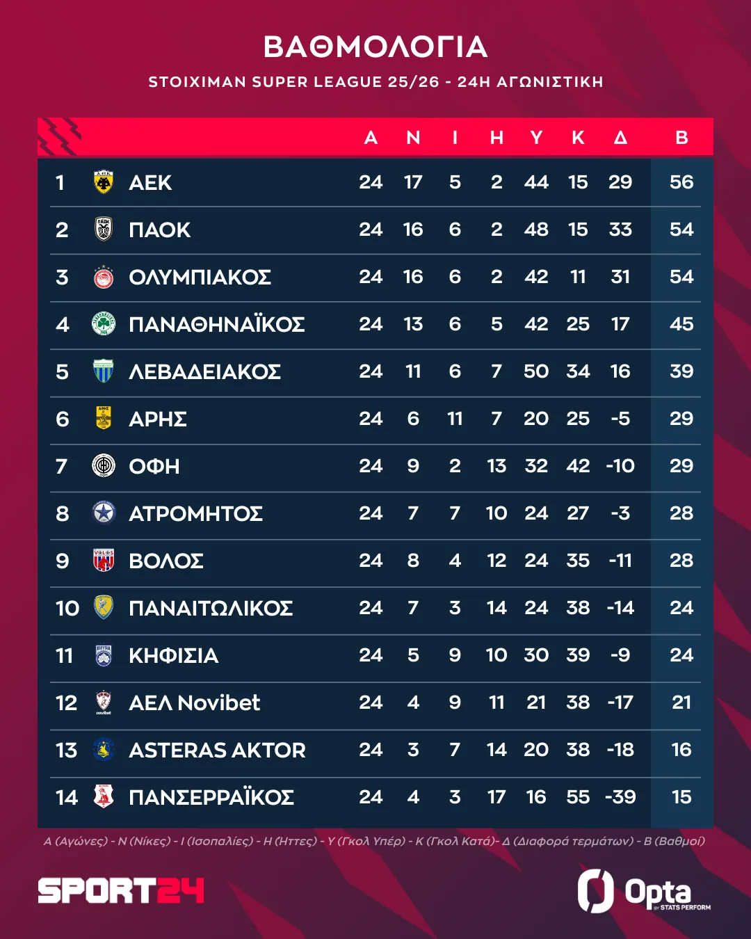 Η βαθμολογία της Stoiximan Super League
