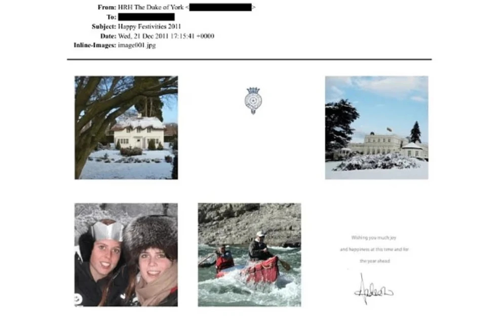 Ωστόσο, σύμφωνα με τα λεγόμενα αρχεία Έπσταϊν , η κάρτα περιείχε τρεις φωτογραφίες των θυγατέρων του, της Βεατρίκης και της Ευγενίας – δύο μαζί του και μία κοινή τους. Οι εικόνες τραβήχτηκαν όταν οι δύο πριγκίπισσες ήταν 23 και 21 ετών αντίστοιχα. Στην κάρτα υπήρχε και σκίτσο που απεικόνιζε έναν άνδρα να περπατά στο χιόνι με σκυλιά, κατευθυνόμενος προς χιονάνθρωπο που κρατά τη βρετανική βασιλική σημαία.