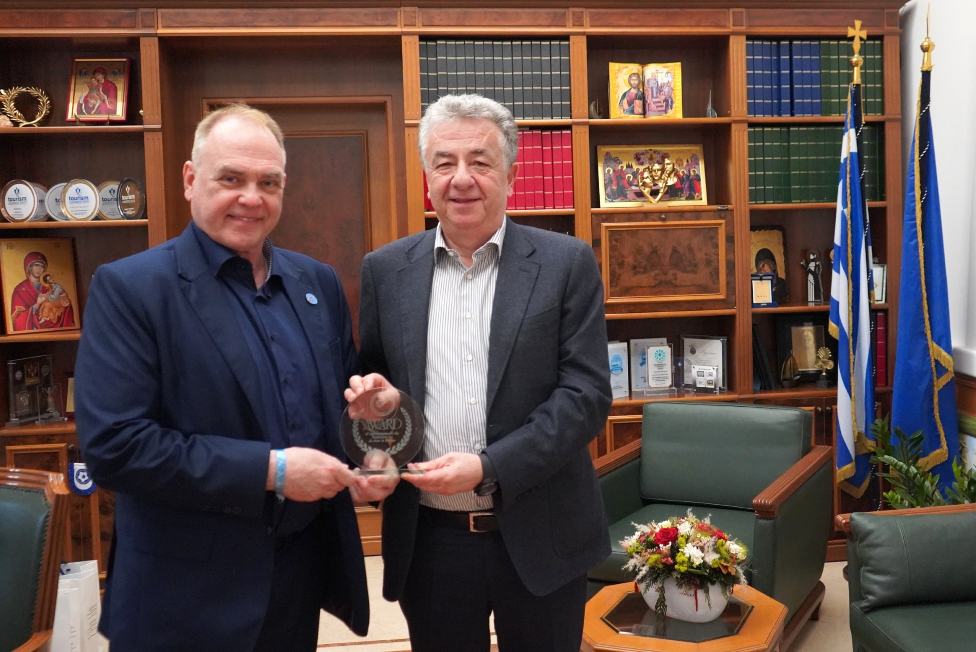 Στην συνάντηση συμμετείχαν ο Πρόεδρος των Τουριστικών και Ταξιδιωτικών Πρακτόρων Κρήτης Μιχάλης Βλατάκης και ο οργανωτικός υποστηρικτής των αγώνων Άγγελος Βλατάκης.
