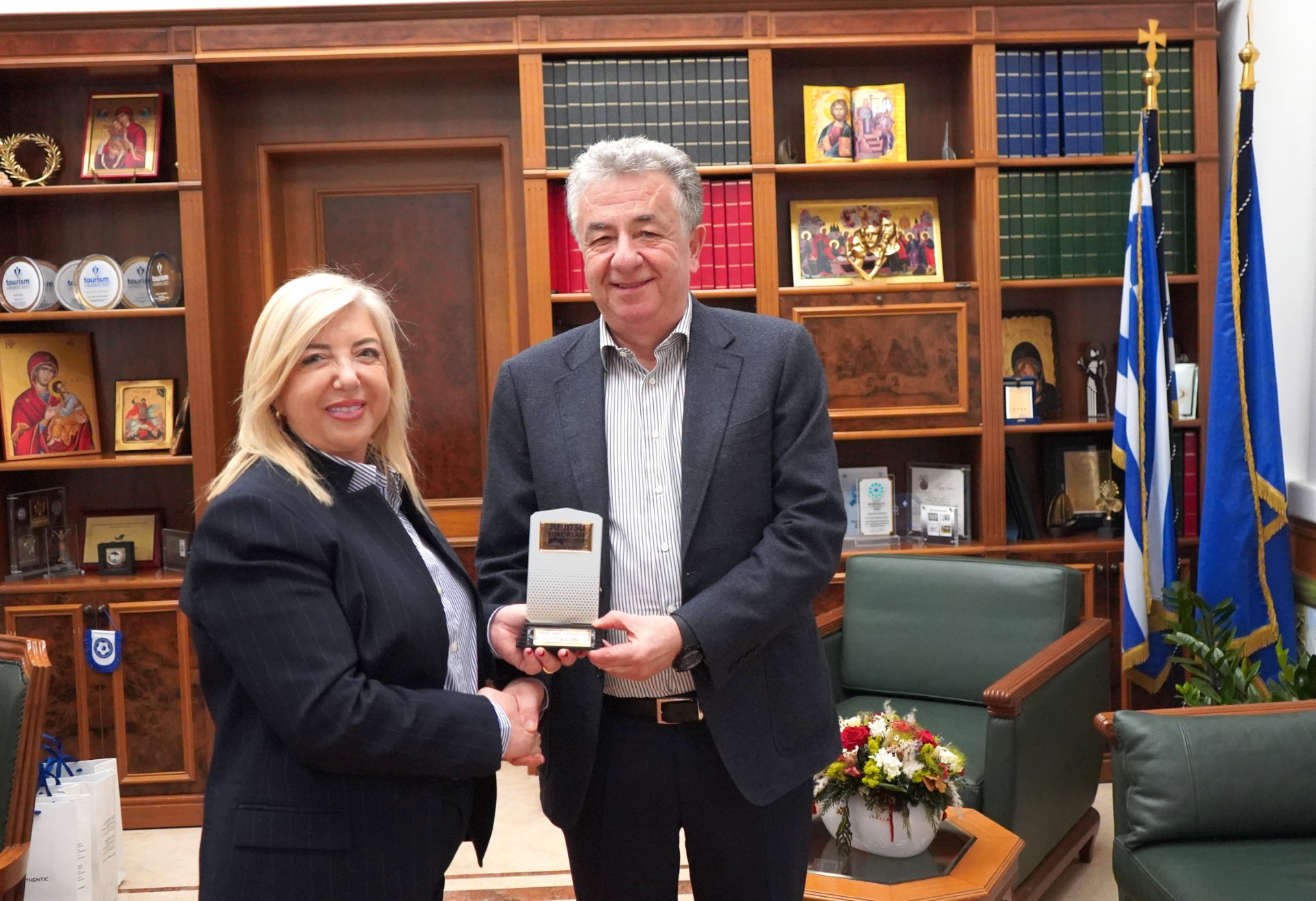 Ο Πρόεδρος της Ευρωπαϊκής Ομοσπονδίας και Αντιπρόεδρος της Παγκόσμιας Ομοσπονδίας Ζίου Ζίτσου Michael Korn, η Πρόεδρος της Ελληνικής Ομοσπονδίας και Αντιπρόεδρος της Ευρωπαϊκής Ομοσπονδίας Ζίου Ζίτσου Μαρία Χαριτοπούλου και ο Γενικός Γραμματέας της Ελληνικής Ομοσπονδίας Ζίου Ζίτσου Βαγγέλης Συνολάκης επισκέφθηκαν σήμερα Τετάρτη τον Περιφερειάρχη Κρήτης Σταύρο Αρναουτάκη.