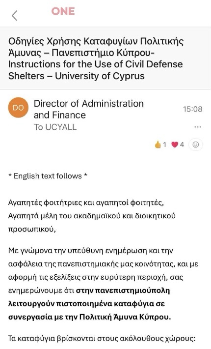 Σύμφωνα με το ηλεκτρονικό μήνυμα που έλαβαν πριν από λίγο οι φοιτητές –ανάμεσά τους και πολλοί Κρητικοί που φοιτούν στο Πανεπιστήμιο Κύπρου- υποδεικνύονται συγκεκριμένα σημεία όπου βρίσκονται τα καταφύγια εντός των πανεπιστημιακών χώρων, καθώς και το σχέδιο δράσης σε περίπτωση ενεργοποίησης σειρήνας. Τονίζεται ρητά ότι η ενημέρωση έχει καθαρά προληπτικό χαρακτήρα.