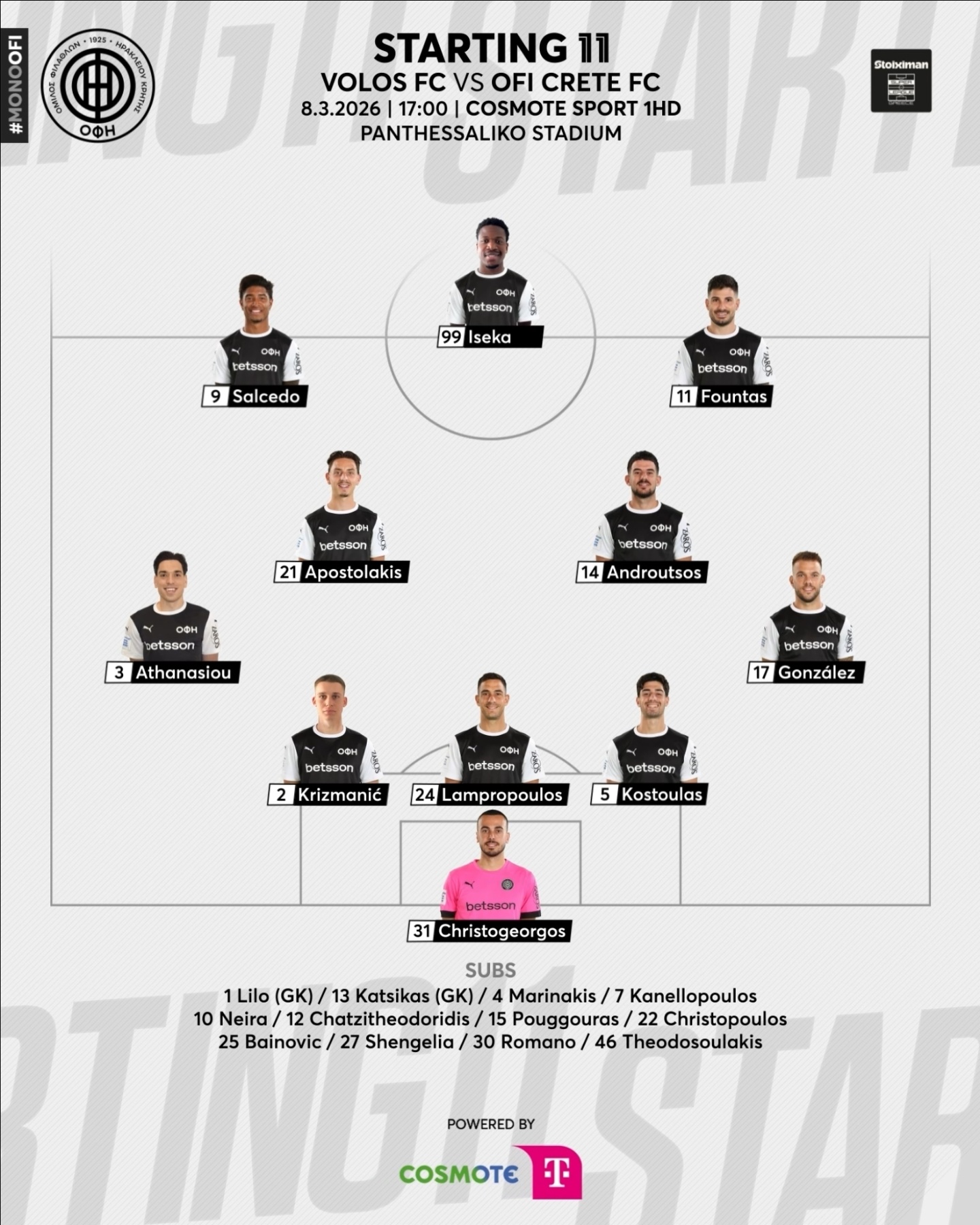 Με επιθετικούς προσανατολισμούς παρατάσσει την ομάδα του στο Πανθεσσαλικό κόντρα στον Βόλο ο Χρήστος Κόντης, καθώς στη βασική ενδεκάδα του ΟΦΗ βρίσκονται τόσο ο Άαρον Ισέκα, όσο και ο Έντι Σαλσίδο.