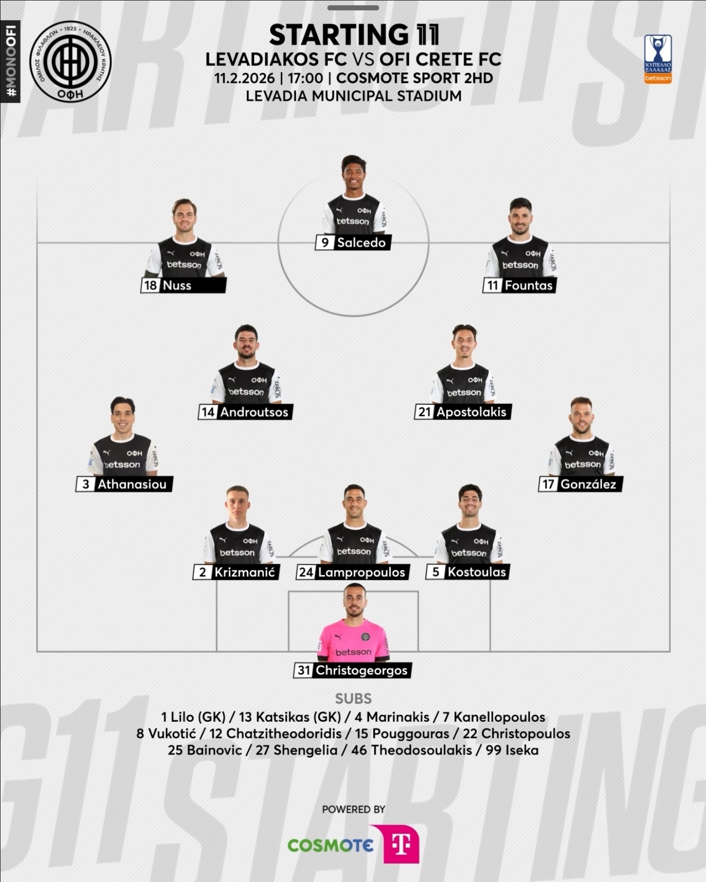 - Η ενδεκάδα του Λεβαδειακού περιλαμβάνει τους Λοντίγκιν, Τσάπρα, Βήχο, Λιάγκα, Μάγκνουσον, Κωστή, Τσοκάι, Γκούμα, Παλάσιο, Μπάλτσι και Όζμπολτ.