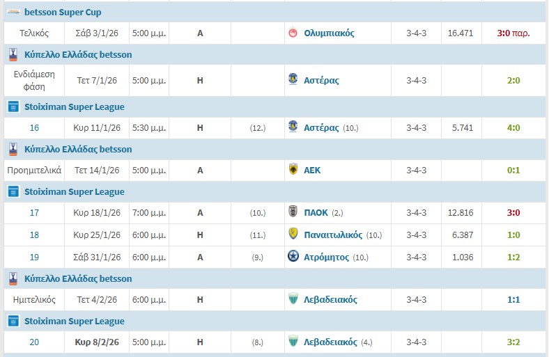 Η κρητική ομάδα το 2026 έχει πάρει 12 βαθμούς μετά τις νίκες της επί του Αστέρα (4-0), Παναιτωλικού (1-0), Ατρομήτου (1-2) και Λεβαδειακό (3-2) και είναι στην πρώτη θέση της σχετικής λίστας, έχοντας όμως έναν αγώνα περισσότερο από τον ΠΑΟΚ που είναι στην 3η θέση με 12 πόντους.