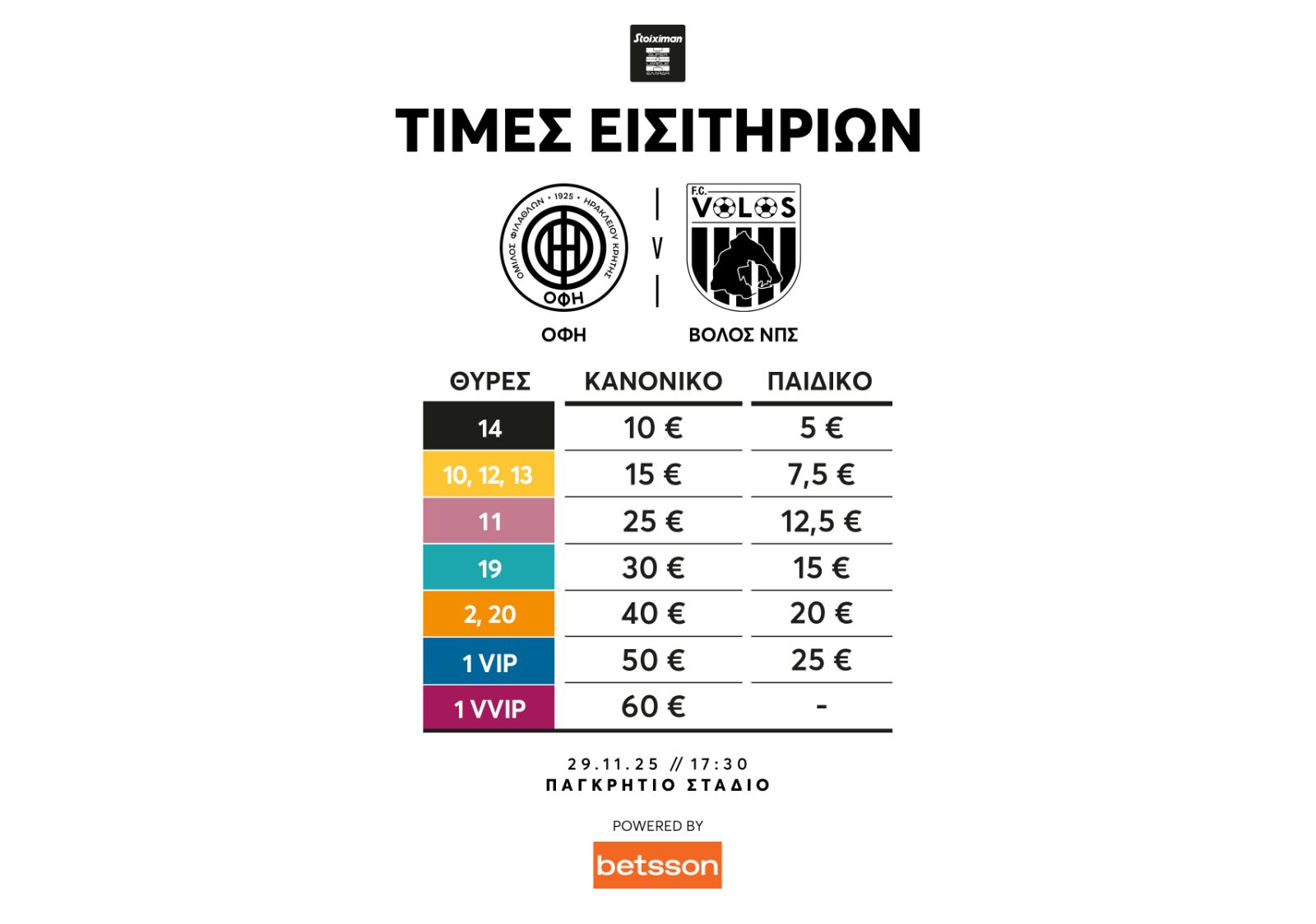 Στην ανακοίνωσή της με όλες τις χρηστικές λεπτομέρειες, η διοίκηση του ΟΦΗ αναφέρει: «H ΠΑΕ ΟΦΗ 1925 ενημερώνει ότι για τον αγώνα με τον Βόλο ΝΠΣ (Σάββατο 29/11, 17:30, Παγκρήτιο Στάδιο), στο πλαίσιο της 12ης αγωνιστικής του πρωταθλήματος Stoiximan Super League, οι τιμές των εισιτηρίων είναι οι παρακάτω: