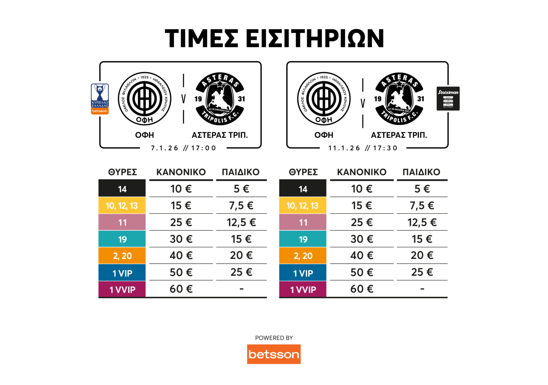 Οι τιμές των εισιτηρίων για τους αγώνες 7/1 και 11/1 έχουν ως εξής (ανά αγώνα):