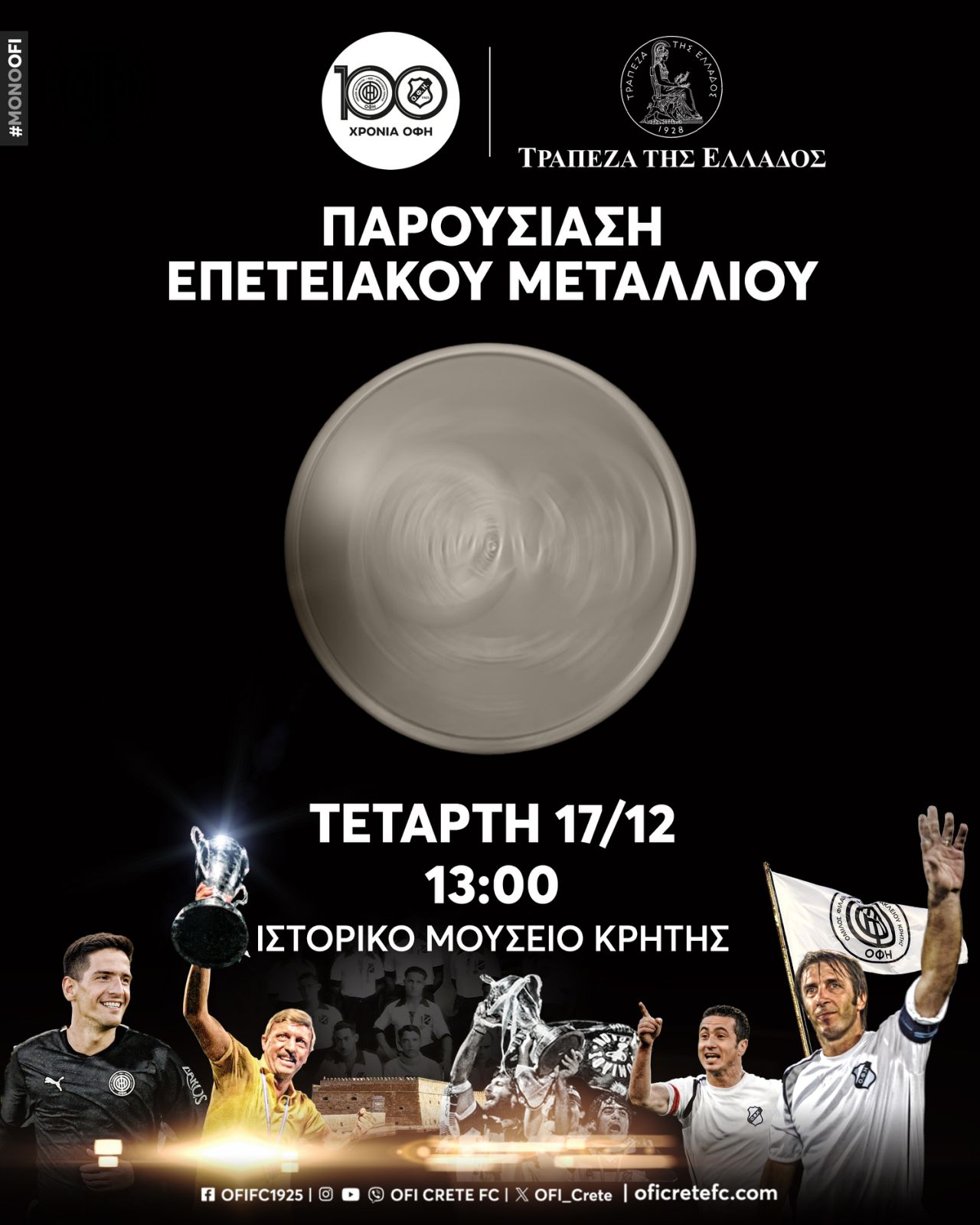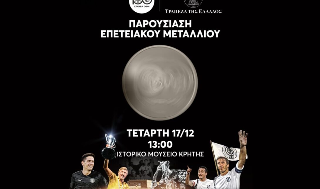 Την Τετάρτη 17/12, στις 13:00, στο Ιστορικό Μουσείο Ηρακλείου, η ΠΑΕ ΟΦΗ σε συνεργασία με την Τράπεζα της Ελλάδας και το Νομισματοκοπείο θα παρουσιάσουν το επετειακό μετάλλιο των 100 χρόνων από την ίδρυση του συλλόγου.