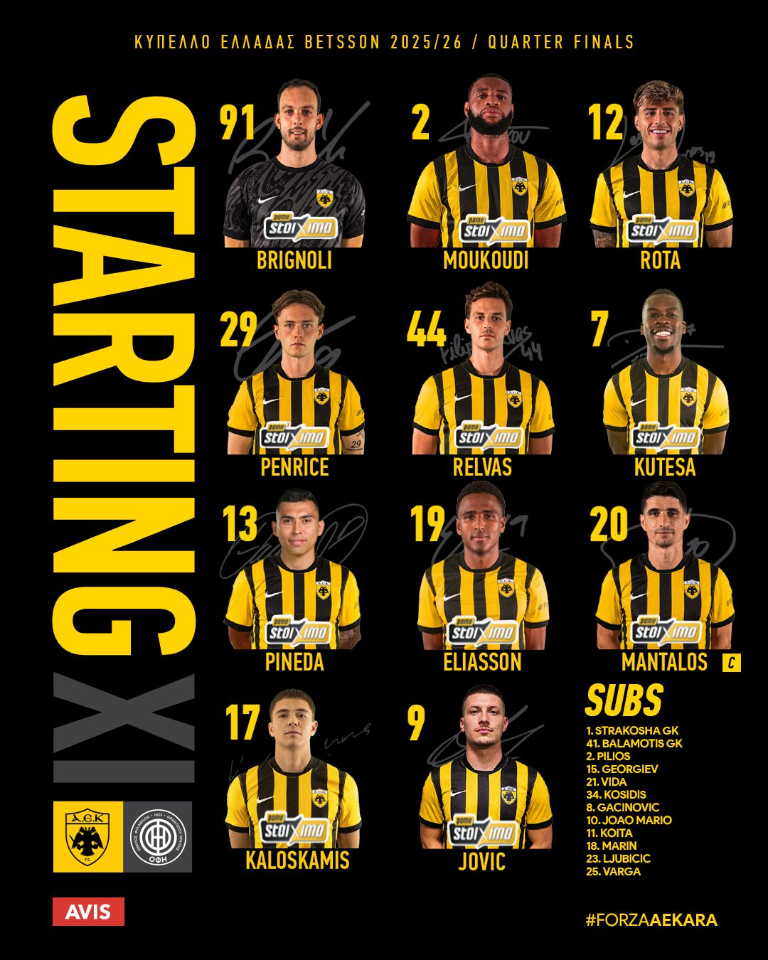 Στον πάγκο βρίσκονται οι: Στρακόσα, Μπαλαμώτης, Πήλιος, Γκεοργκίεφ, Βίντα, Κοσίδης, Γκατσίνοβιτς, Ζοάο Μάριο, Κοϊτά, Μαρίν, Λιούμπισιτς, Βάργκα.
