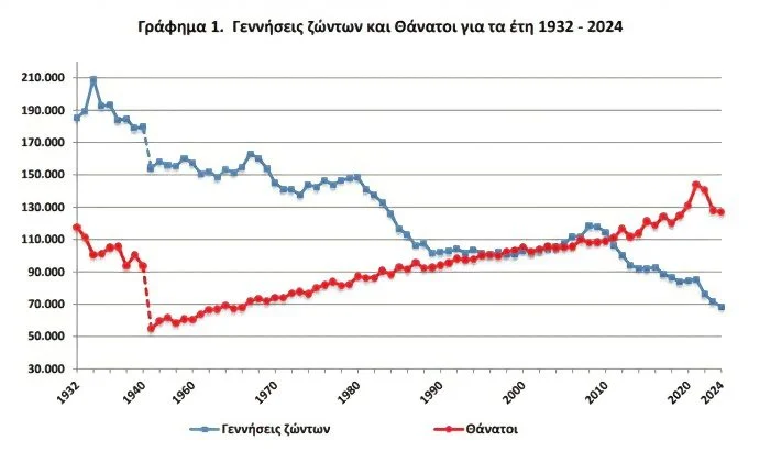 Όπως αναφέρει το άρθρο του Νίκου Μαρουλίδη, στο iefimerida.gr, το δημογραφικό εξελίσσεται σε μείζον εθνικό ζήτημα, καθώς σύμφωνα με τα νεότερα στοιχεία της ΕΛΣΤΑΤ, η Ελλάδα το 2024 μέτρησε 126.916 θανάτους έναντι μόλις 68.467 γεννήσεων, καταγράφοντας μια «απώλεια» που ισοδυναμεί με έναν ολόκληρο αστικό πληθυσμό. Οι επιστήμονες κρούουν τον κώδωνα του κινδύνου και καλούν την Πολιτεία να θέσει την αντιμετώπιση του προβλήματος στην κορυφή της ατζέντας.