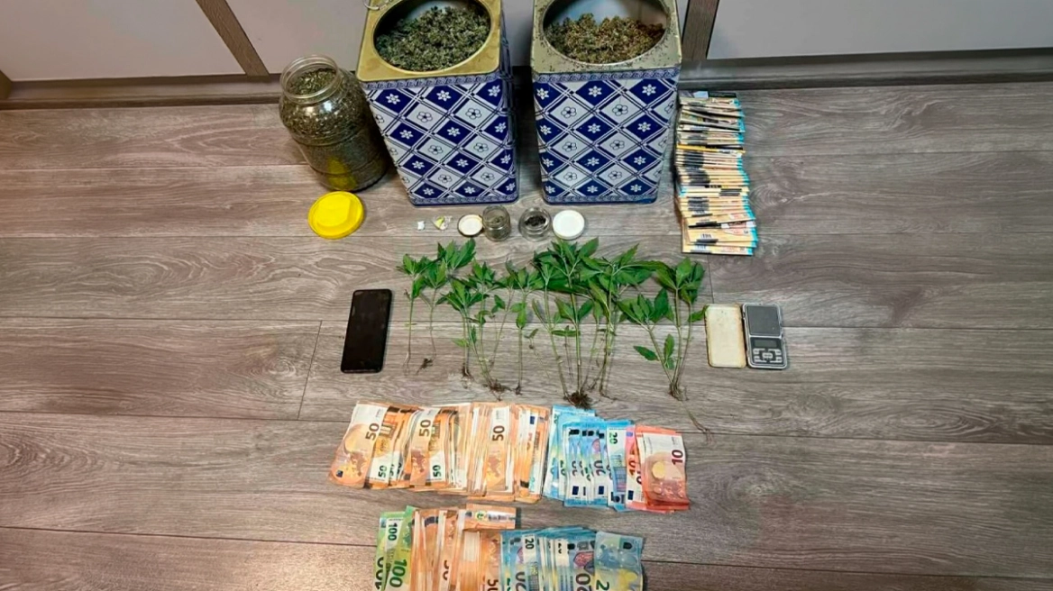 - Βρέθηκαν 22 φυτά κάνναβης, χρηματικό ποσό και ναρκωτικά χάπια στα σπίτια των συλληφθέντων.