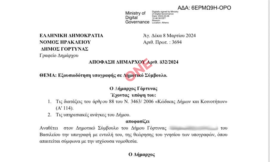 Με αυτήν, ο Δήμαρχος παραχώρησε στον δημοτικό σύμβουλο της αντιπολίτευσης το δικαίωμα να θεωρεί το γνήσιο της υπογραφής πολιτών «όπου απαιτείται σύμφωνα με την ισχύουσα νομοθεσία».