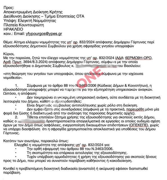 Μάλιστα στο αίτημα που απέστειλε στην Αποκεντρωμένη, διατυπώνει επίσης σοβαρές επιφυλάξεις για τη χρήση της σφραγίδας.