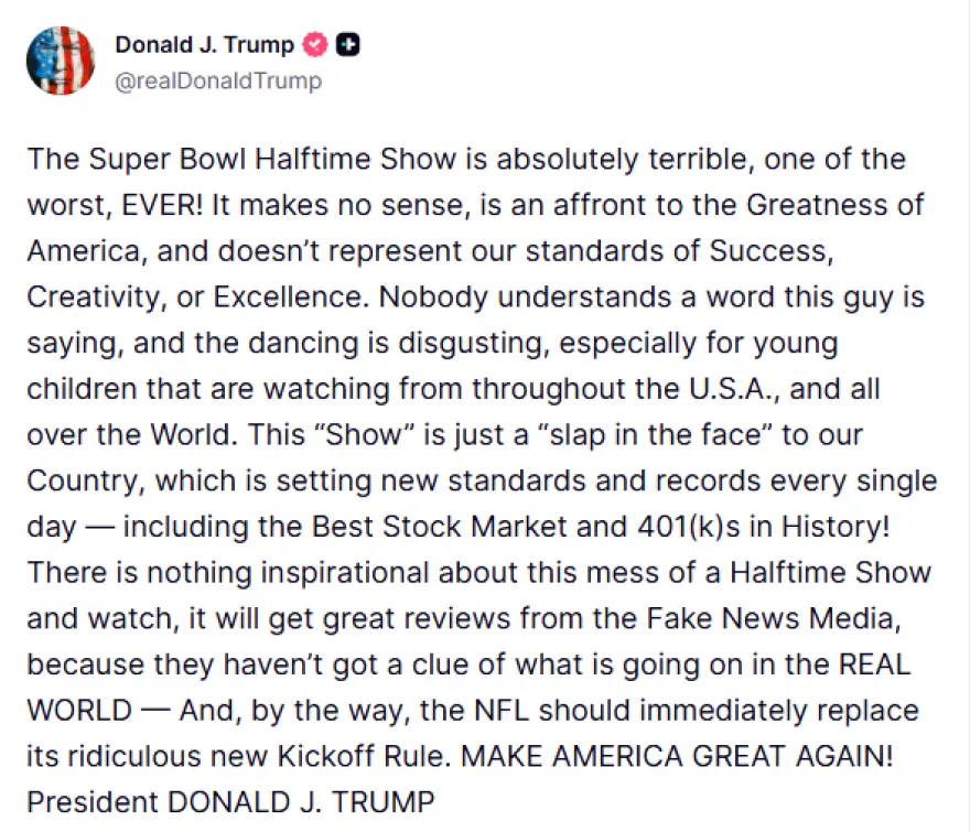 «Το σόου του ημιχρόνου του Super Bowl είναι απολύτως φρικτό, ένα από τα χειρότερα ποτέ! Δεν έχει κανένα νόημα, είναι προσβολή για το μεγαλείο της Αμερικής και δεν αντιπροσωπεύει τα πρότυπα επιτυχίας, δημιουργικότητας ή αριστείας που έχουμε», έγραψε ο Τραμπ σε μια μακροσκελή ανάρτηση στο Truth Social λίγα λεπτά μετά το τέλος του σόου.