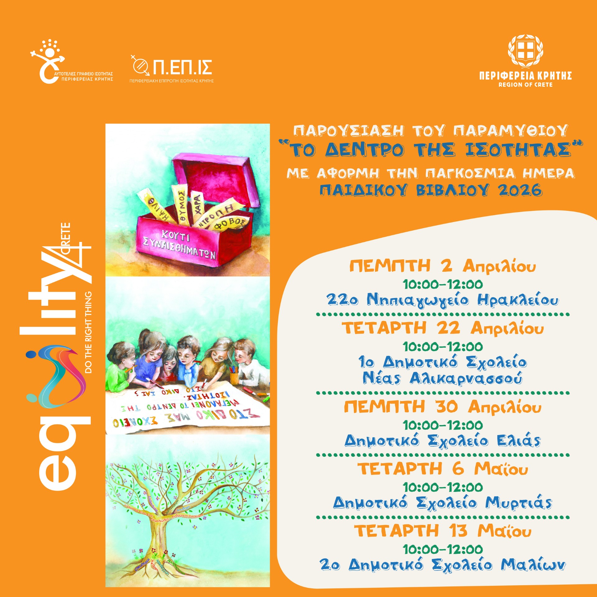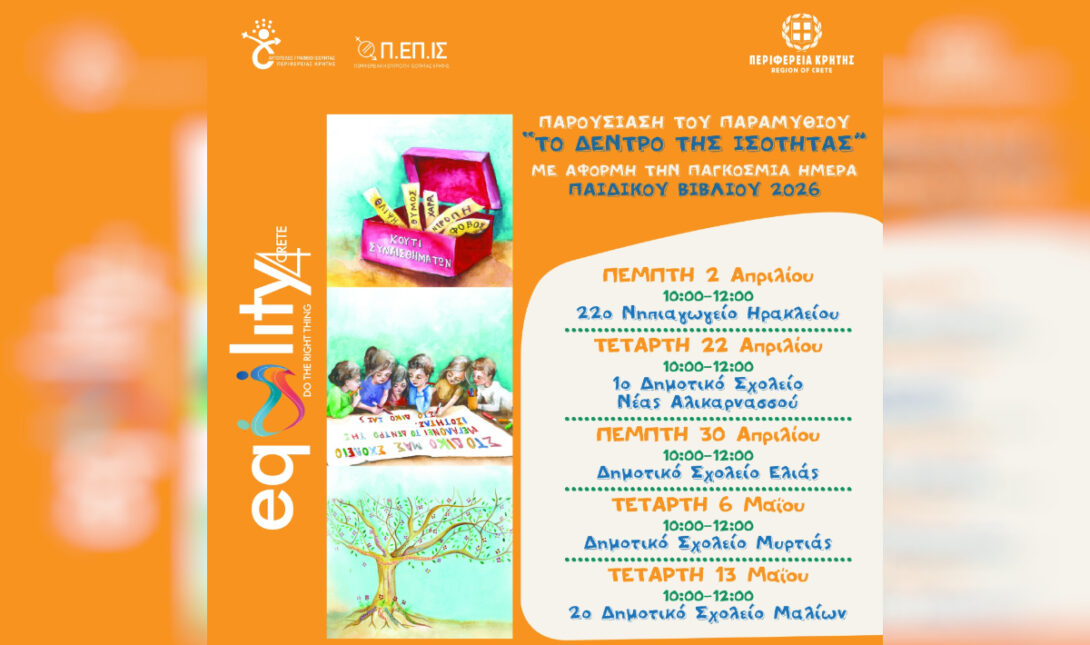 Με αφορμή την Παγκόσμια Ημέρα Παιδικού Βιβλίου 2026, μια ημέρα αφιερωμένη στη δύναμη της παιδικής λογοτεχνίας που εμπνέει, καλλιεργεί τη φαντασία και διαμορφώνει στάσεις και αξίες από την πρώιμη ηλικία, η Περιφέρεια Κρήτης υλοποιεί μια σειρά βιωματικών δράσεων, με τίτλο «Ένα ξεχωριστό δώρο για τη μαμά μου», που βασίζονται στο παιδικό βιβλίο «Το Δέντρο της Ισότητας», το οποίο έχει εκδοθεί με την υποστήριξη της Περιφέρειας Κρήτης.