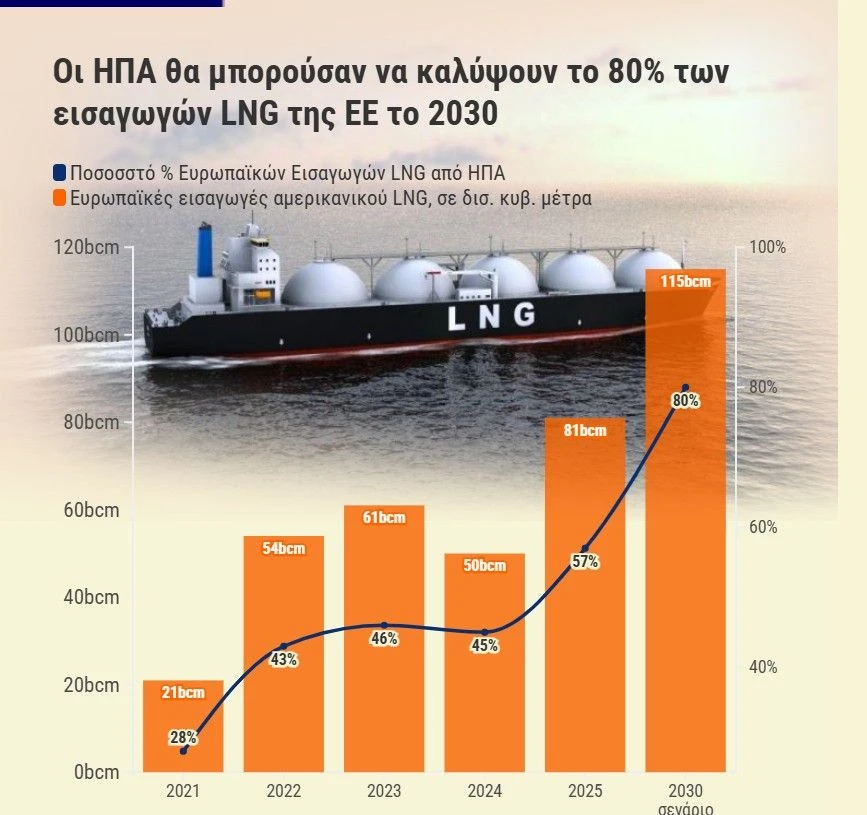 Ήδη σύμφωνα με στοιχεία του Institute for Energy Economics and Financial Analysis το αμερικανικό LNG που εισήχθη στην Ε.Ε. το 2025 αυξήθηκε στα 81 δισ. κυβικά μέτρα από μόλις 21 δισ. κυβικά μέτρα το 2021. Όταν το ρωσικό φυσικό αέριο έχει βουτήξει… το 2025 στα 37 δισ. κ.μ. από 151 δισ. κ.μ. το 2021.