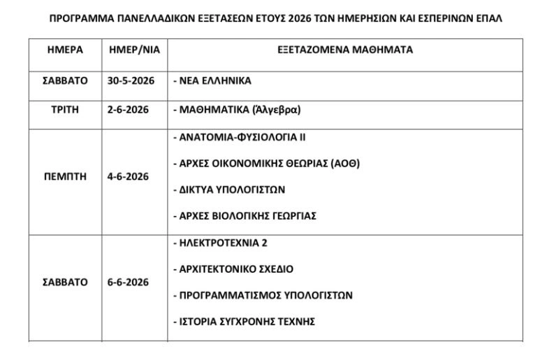 - Το Υπουργείο Παιδείας ανακοίνωσε τις ημερομηνίες και διαδικασίες για τις Πανελλήνιες 2026 σε ΓΕΛ και ΕΠΑΛ.