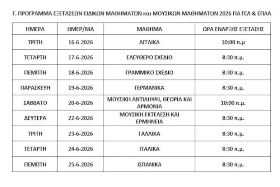 Οι Πανελλήνιες 2026 για τα ημερήσια και τα εσπερινά ΕΠΑΛ κάνουν «πρεμιέρα» το Σάββατο 30 Μαΐου με το μάθημα των Νέων Ελληνικών και συνεχίζονται την Τρίτη 2 Ιουνίου με τα Μαθηματικά (Άλγεβρα).