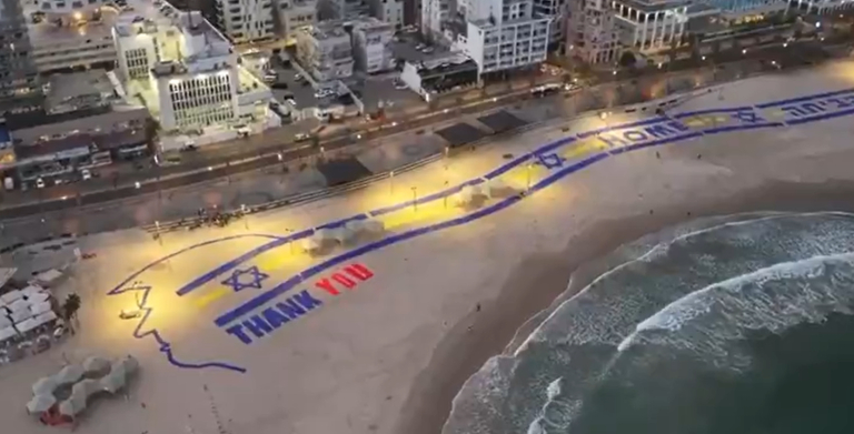 • Ένα τεράστιο πανό με τη λέξη «Thank you» και τη σιλουέτα του Τραμπ εμφανίστηκε στην παραλία του Τελ Αβίβ.