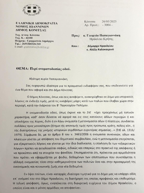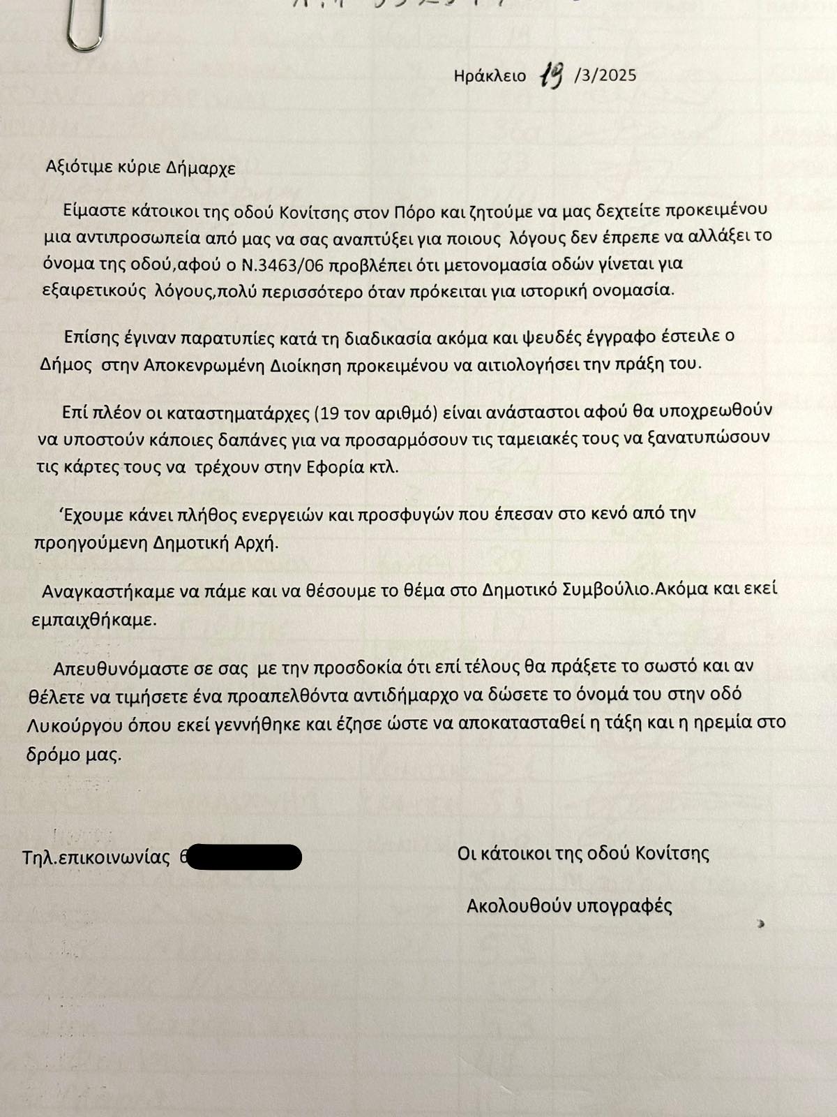 Τότε ανακάλυψαν ότι ψευδώς, όπως οι ίδιοι σχολιάζουν, αναφερόταν σε έγγραφο που είχε πάει στην Αποκεντρωμένη Διοίκηση Κρήτης για τον έλεγχο νομιμότητας της απόφασης του Δημοτικού Συμβουλίου, πως η απόφαση μετονομασίας της οδού Κονίτσης έγινε με τη σύμφωνη γνώμη των κατοίκων. Κάτι που σύμφωνα με τους κατοίκους, δεν ήταν αλήθεια.