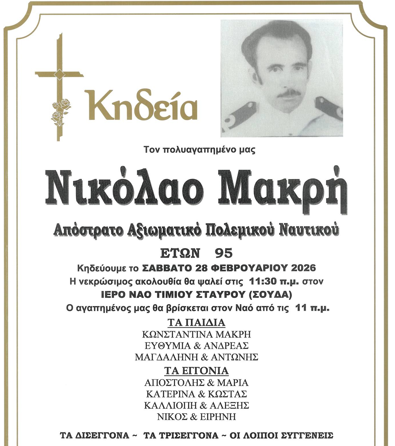 Η νεκρώσιμη ακολουθία θα τελεστεί το Σάββατο 28 Φεβρουαρίου 2026, στις 11:30 π.μ., στον Ιερό Ναό Τιμίου Σταυρού στη Σούδα.