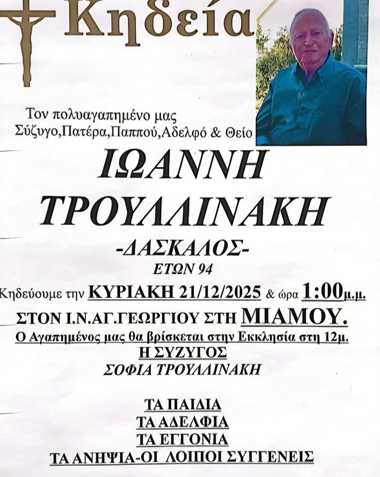 Έφυγε σήμερα Σάββατο πλήρης ημερών ,σε ηλικία 94 ετων, ο δάσκαλος Γιάννης Τρουλινάκης απο τη Μιαμού.