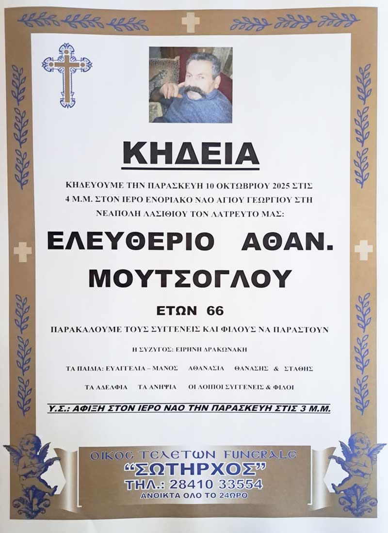 Η κηδεία του θα γίνει αύριο Παρασκευή 10/10 στις 4 μ.μ. στον Ιερό Ναό Αγίου Γεωργίου στη Νεάπολη Λασιθίου.