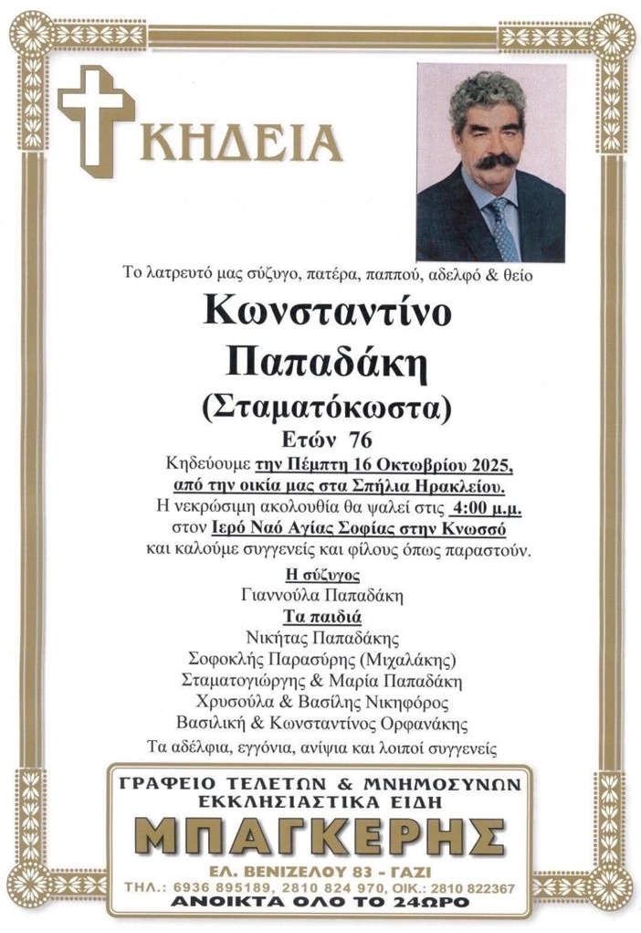 Η κηδεία του θα γίνει σήμερα Πέμπτη 16/10 στις 4:00 μ.μ. στον ιερό ναό Αγίας Σοφίας στην Κνωσσό.