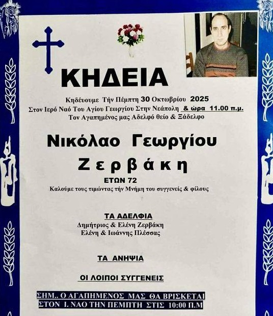 - Η τοπική κοινωνία της Νεάπολης θρηνεί τον θάνατο του Νίκου Ζερβάκη, που έφυγε από τη ζωή στα 72 του χρόνια.