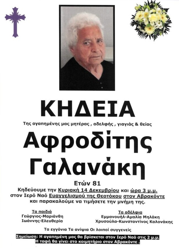 Βαρύ πένθος στο Λασίθι μετά την είδηση του θανάτου της αγαπητής Αφροδίτης Γαλανάκη, η οποία έφυγε από τη ζωή σε ηλικία 81 ετών.
