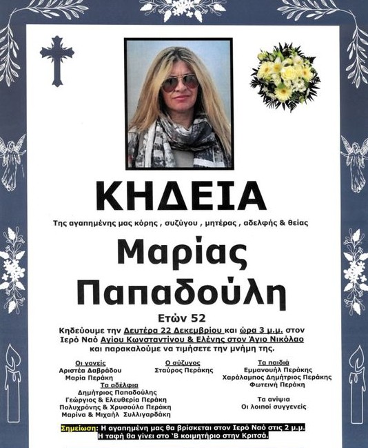 Σε ηλικία 52 ετών εγκατέλειψε τα εγκόσμια η Μαρία Παπαδούλη, από τον Άγιο Νικόλαο.