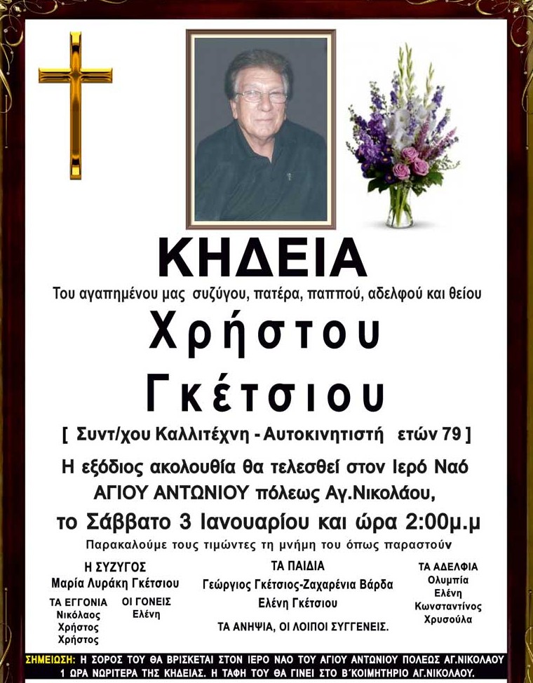 Σε ηλικία 79 ετών εγκατέλειψε τα εγκόσμια ο Χρήστος Γκέτσιος, από τον Άγιο Νικόλαο.