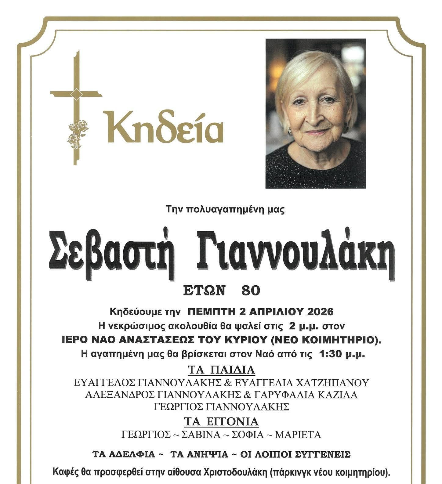 Η εξόδιος ακολουθία θα τελεστεί αύριο, Πέμπτη 2/4, στις 14:00, στον Ιερό Ναό Αναστάσεως του Κυρίου (Νέο Κοιμητήριο Ηρακλείου). Η σορός θα βρίσκεται στον Ιερό Ναό από τις 13:30.