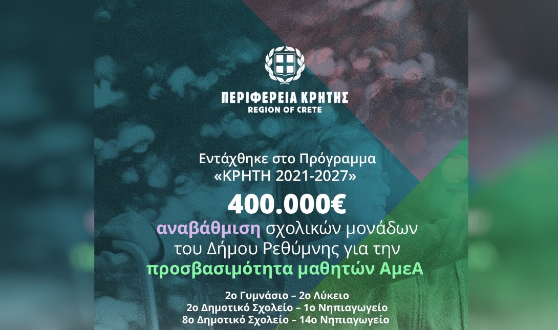 Την ένταξη στο Πρόγραμμα «Κρήτη 2021-2027» του έργου για την αναβάθμιση και συμπλήρωση των κτιριακών εγκαταστάσεων της Πρωτοβάθμιας και Δευτεροβάθμιας Εκπαίδευσης στον Δήμο Ρεθύμνης, υπέγραψε ο Περιφερειάρχης Κρήτης Σταύρος Αρναουτάκης.