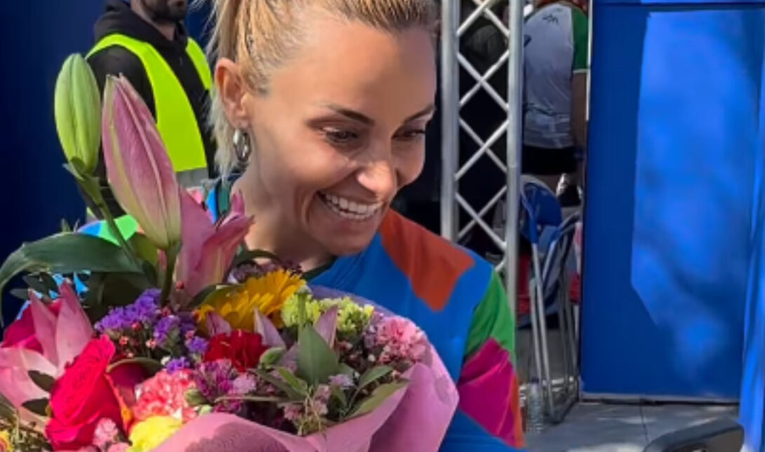 Η Μιλλούση τη στιγμή που παρέλαβε τα λουλούδια, βρισκόταν στον Ημιμαραθώνιο της Αθήνας και έκανε βίντεο κλήση με τον σύζυγό της, ανταλλάζοντας ευχές.