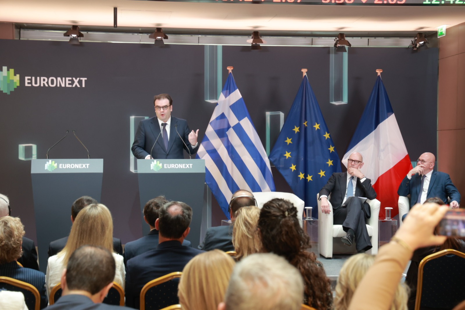 Θέλω να καλωσορίσω τον Γάλλο Υπουργό Οικονομικών, Roland Lescure, και να ευχαριστήσω θερμά τον Διευθύνοντα Σύμβουλο της Euronext, Stéphane Boujnah, για την εμπιστοσύνη τους στην Ελλάδα. Χαιρετίζω επίσης την παρουσία των Πρέσβεων των κρατών-μελών της Ευρωπαϊκής Ένωσης στα οποία δραστηριοποιείται η Euronext. Η παρουσία τους αυτή αναδεικνύει τον πανευρωπαϊκό χαρακτήρα του εγχειρήματος.
