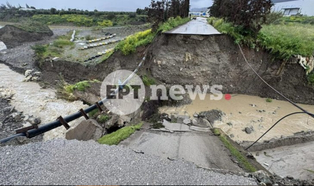 - Η γέφυρα στο δρόμο προς Τυμπάκι «κόπηκε» στα δύο, οδηγώντας σε προληπτικό κλείσιμο του δρόμου.