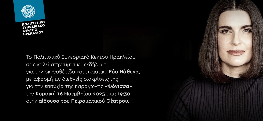 Τιμητική εκδήλωση για την σκηνοθέτιδα, σκηνογράφο και ενδυματολόγο Εύα Νάθενα διοργανώνει το Πολιτιστικό Συνεδριακό Κέντρο Ηρακλείου την Κυριακή 16 Νοεμβρίου 2025, στις 19:30, στο Πειραματικό Θέατρο.